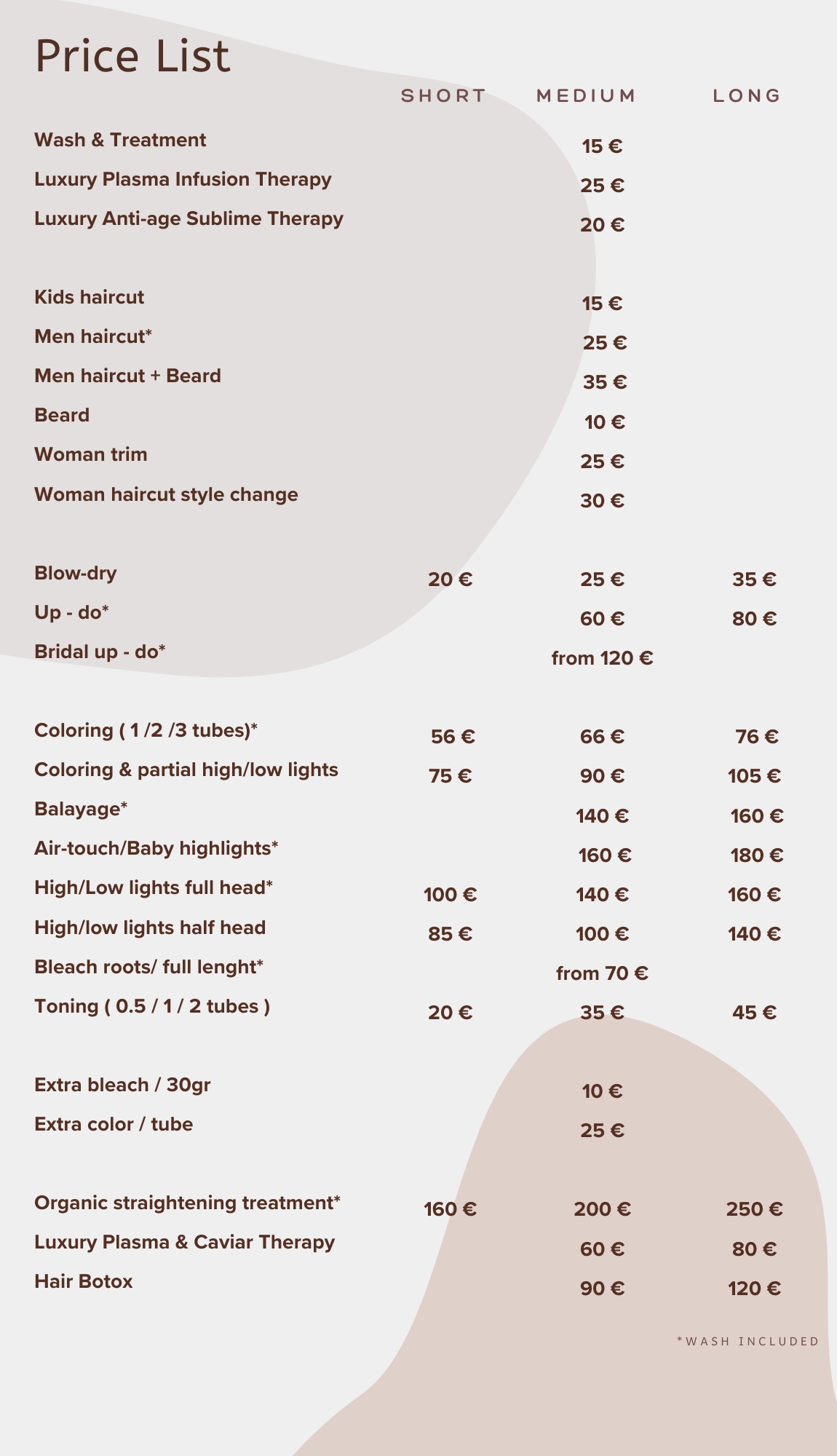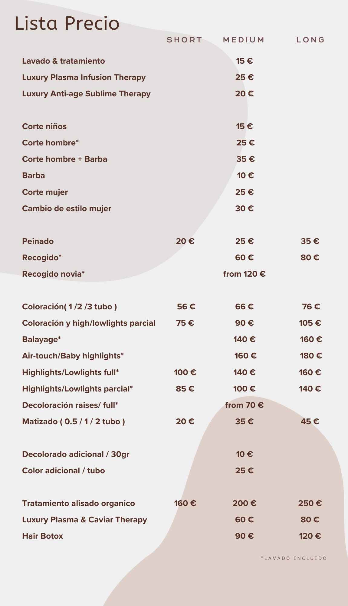 Lavado / Corte de Cabello / Peinado / Teñido / Decoloración / Tratamientos Especiales / Extensiones